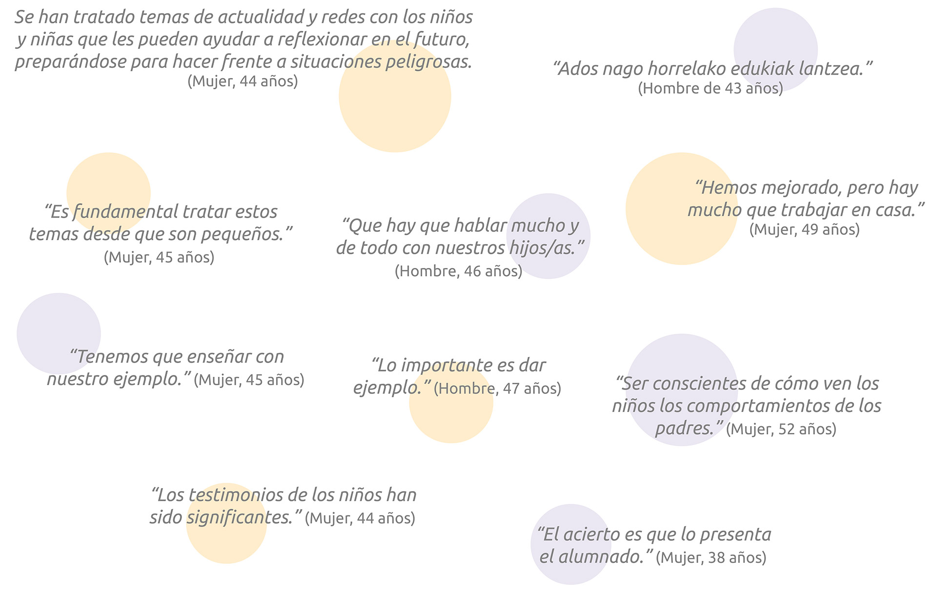 Tailerrei eta jardunbide egokiei buruzko pertzepzioak modu irekian adierazteko aukera ere izan zuten. Komentario gehienak positiboak izan ziren, landutako gaien egokitasuna azpimarratuz eta erabilitako metodologia eskertuz. Era berean, hainbat familiak adierazi zuten garrantzitsua dela eduki horiek eskolan zein familian lantzen jarraitzea, eta azpimarratu zuten beharrezkoa dela elkarrizketari eustea, adibidetik laguntzea eta errespetuan eta berdintasunean oinarritutako hezkuntza indartzea.